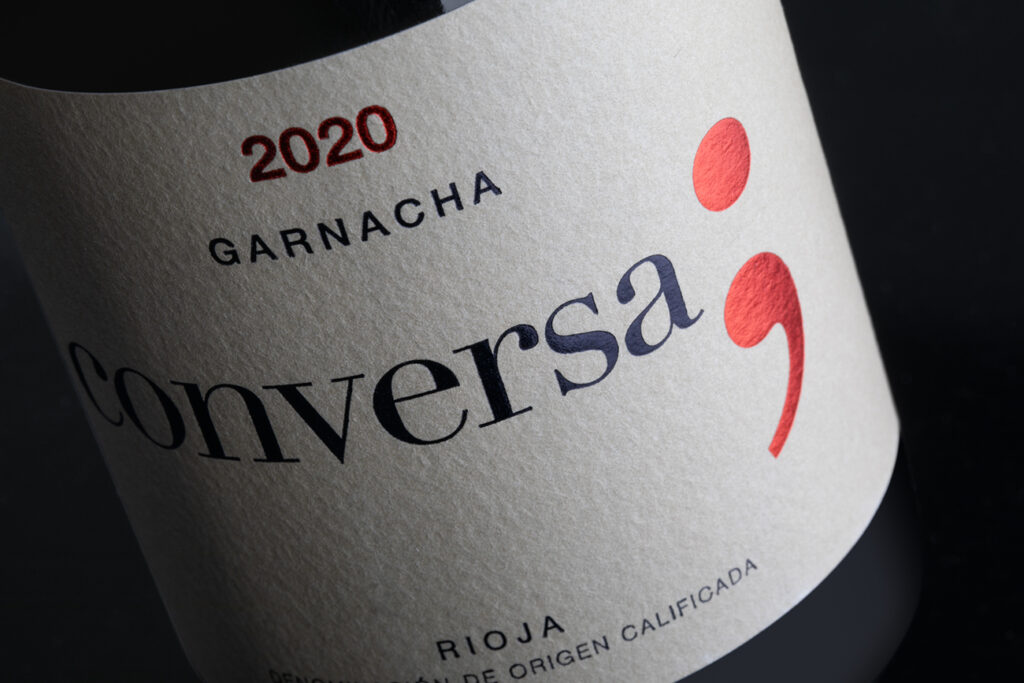 Una etiqueta que combina dos estampaciones: roja y negra sobre un papel algodonado.