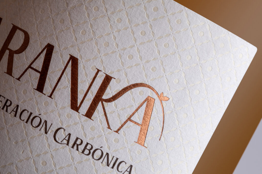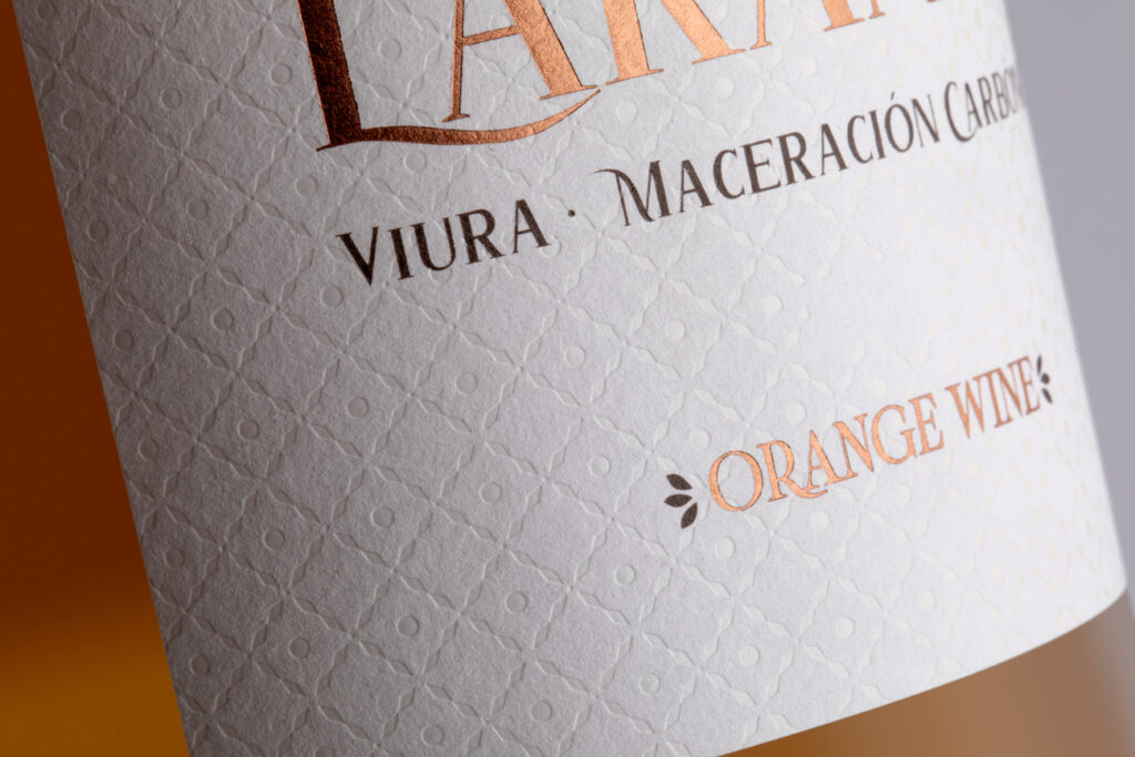 Esta etiqueta de apariencia sencilla lleva una estampación cobre perfecta para destaca la marca y el tipo de vino del que se trata, un original vino naranja. Además, una segunda estampación transparente da una textura especial al fondo algodonado.
