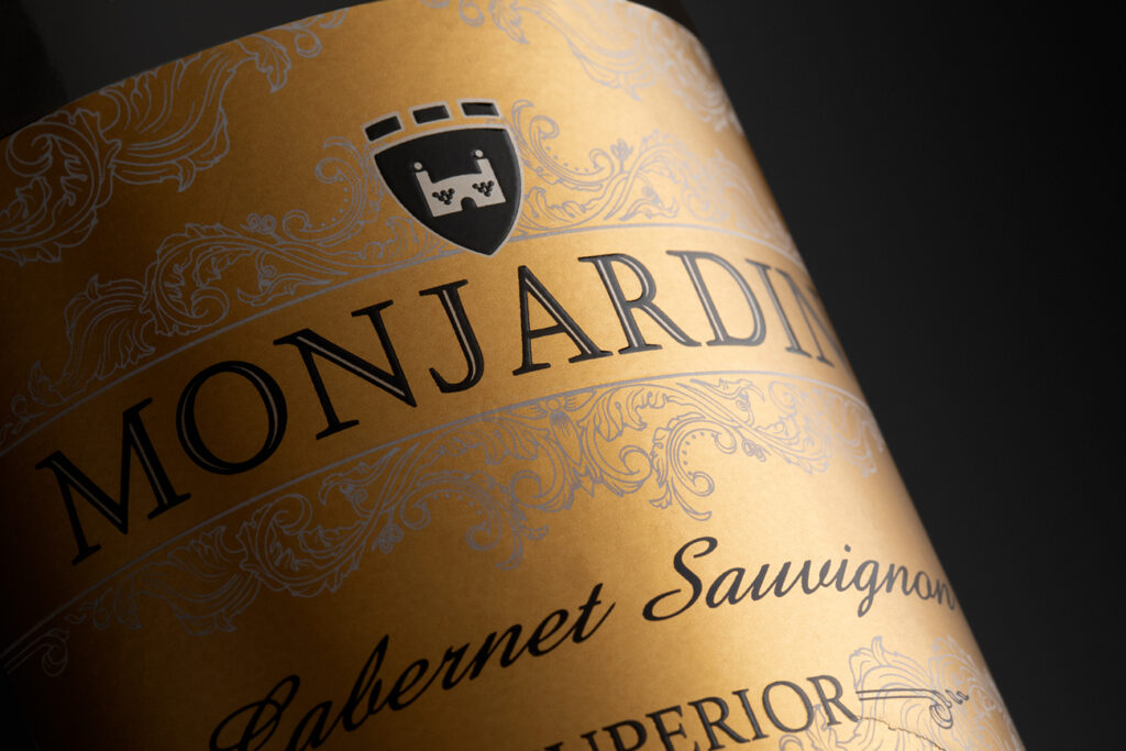 La clave de esta etiqueta está en la elección de un papel satinado dorado con un troquelado especial sobre el que se imprime una tinta plata sobre la marca y el castillo a la que se le da brillo mediante una serigrafía. La orla impresa en blanco completa la elegancia de esta presentación.