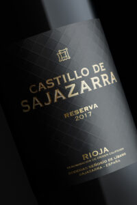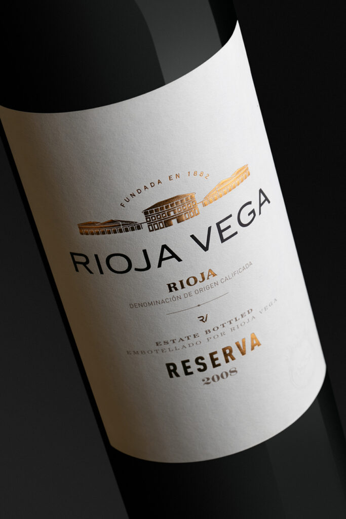 Esta etiqueta, impresa sobre un papel Tintoretto, incluye dos estampaciones, oro sobre el edificio y la categoría del vino, y negro sobre la marca Rioja Vega. El edificio se realza aún más con un relieve sobre la estampación.