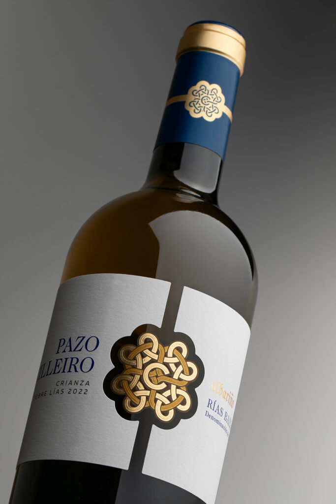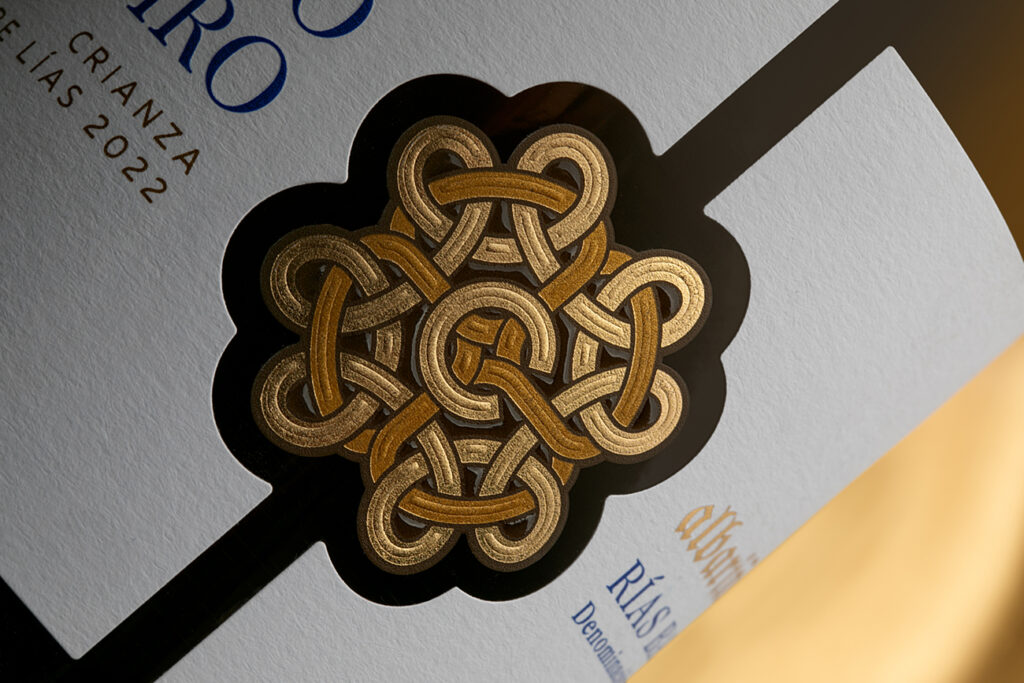 El rosetón central del Pazo Cilleiro sobre lías esconde varios “secretos” para dar la sensación de estar impreso sobre la botella en el centro de la etiqueta. Esto se consigue mediante la combinación de troqueles, superficies de impresión y serigrafía. Además, las filigranas alternan estampaciones oro y cobre y relieves. También el nombre de la variedad, «albariño», se destaca con una estampación oro y relieve.
