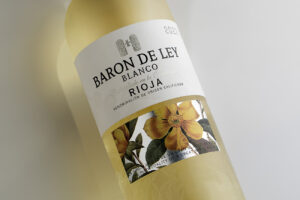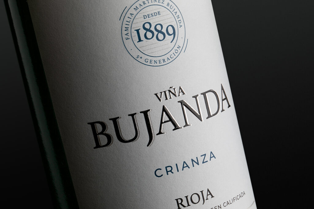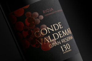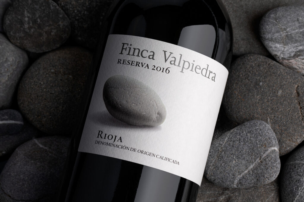 Esta etiqueta de Finca Valpiedra Reserva pone el énfasis en la imagen de la piedra, con una buena foto bien iluminada y con una sombra que le da volumen. La contribución desde la impresión es darle aún más realce con un relieve y una serigrafía sobre el canto rodado, que descansa en un papel algodonado.