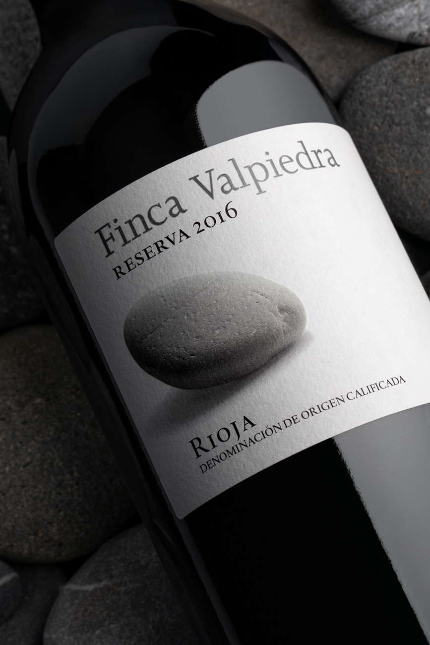 Esta etiqueta de Finca Valpiedra Reserva pone el énfasis en la imagen de la piedra, con una buena foto bien iluminada y con una sombra que le da volumen. La contribución desde la impresión es darle aún más realce con un relieve y una serigrafía sobre el canto rodado, que descansa en un papel algodonado.