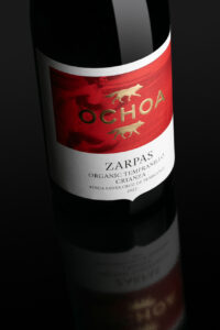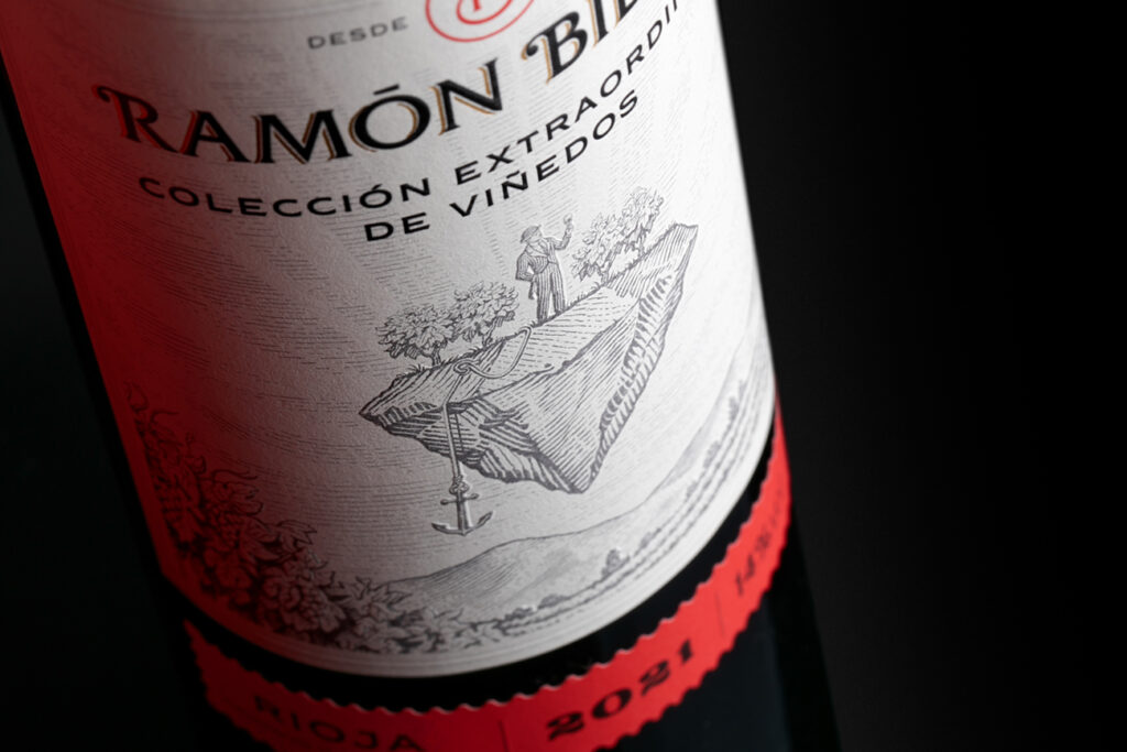 Esta etiqueta, además del formato característico de Ramón Bilbao, incluye estampación oro y serigrafía sobre la marca y un relieve que se aplica selectivamente sobre varias zonas de la imagen. El viajero que se eleva sobre un fragmento de tierra como en un globo y los viñedos y arbolado del paisaje que deja abajo.