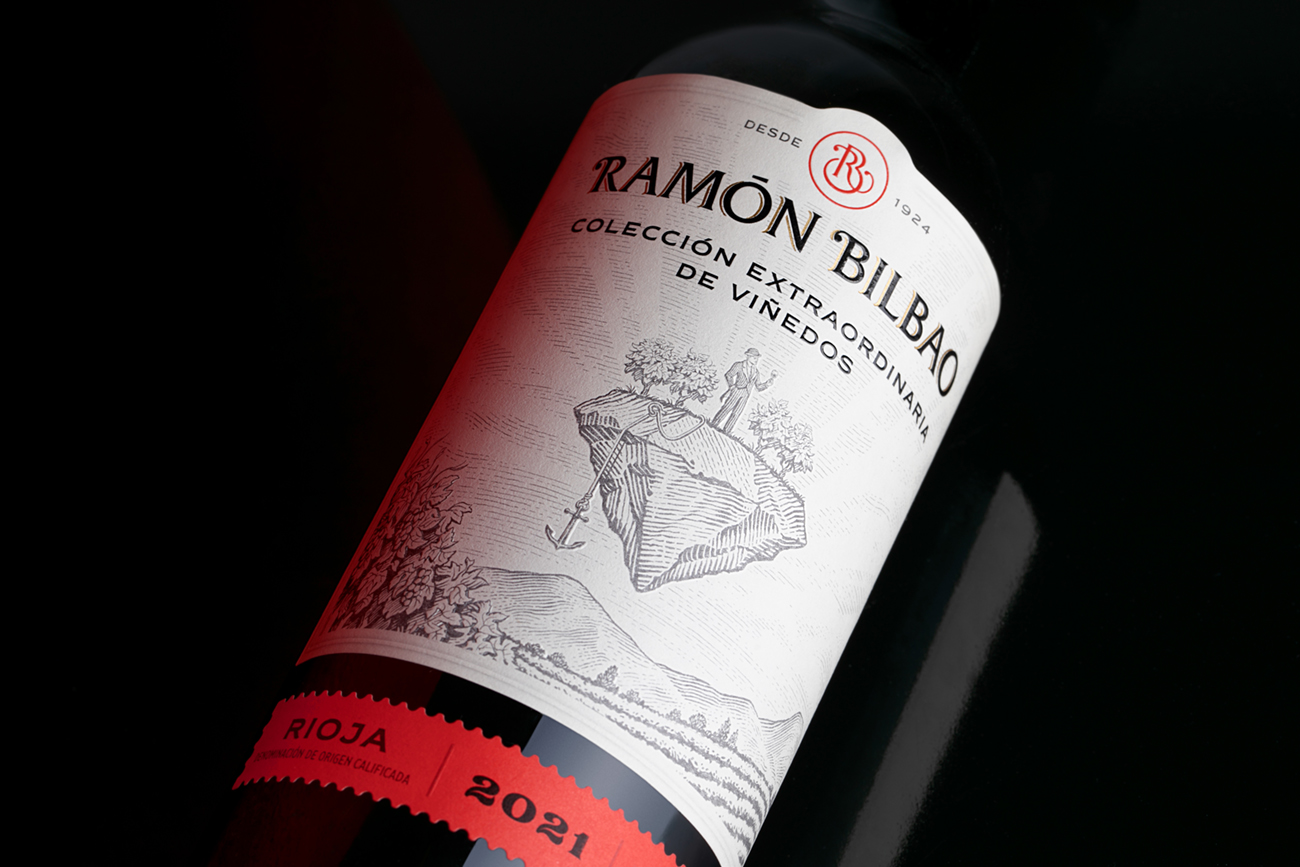 La etiqueta refleja el viaje de Ramón Bilbao por Rioja coleccionando paisajes y cepas que cuentan historias diferentes, “arrancándolas” de la tierra para unirlas y elevarlas