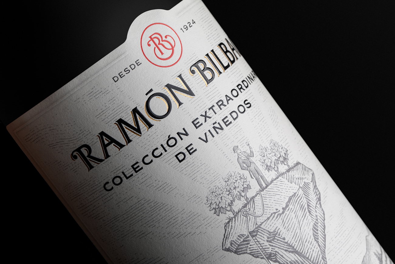 Esta etiqueta, además del formato característico de Ramón Bilbao, incluye estampación oro y serigrafía sobre la marca y un relieve que se aplica selectivamente sobre varias zonas de la imagen. El viajero que se eleva sobre un fragmento de tierra como en un globo y los viñedos y arbolado del paisaje que deja abajo.