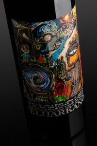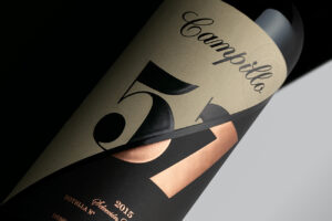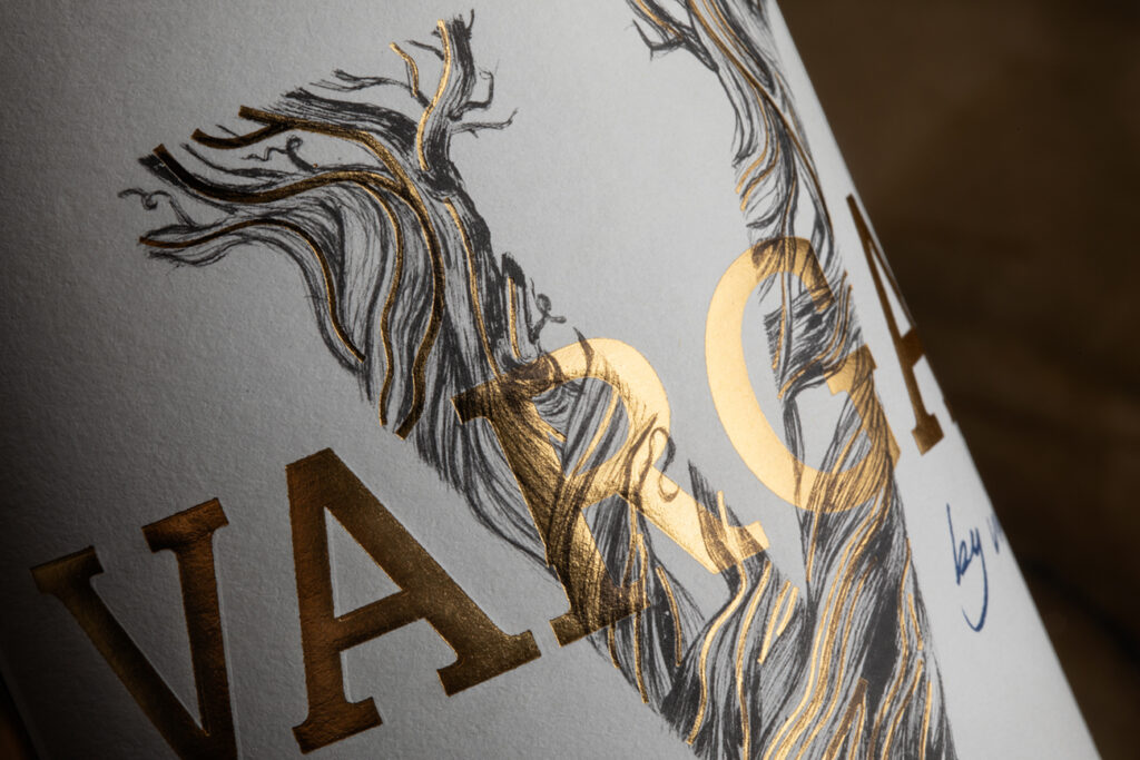 En esta etiqueta destaca el trabajo sobre la “uve cepa” de Vargas con tres técnicas aplicadas sobre determinadas líneas y sobre la propia marca: estampación oro, relieve y serigrafía. El azul es el característico de la bodega.